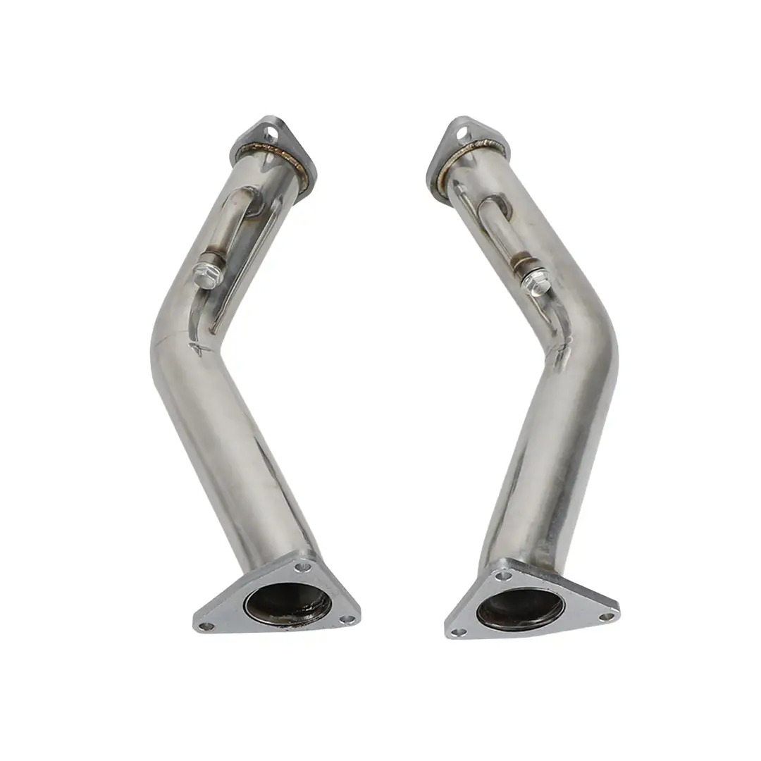 Kents 370Z/G37 test pipes are a direct-fit replacement for the factory catalytic converters on the VQ37VHR and VQ35HR engines, designed to reduce exhaust restriction and free up the flow that stock cats hold back. Built with a 2.5″ inlet and 2.5″ outlet, they match the diameter of the OEM exhaust piping for a straightforward installation with no modifications required. Each set includes gaskets and hardware, so everything you need to bolt them up is in the box.
